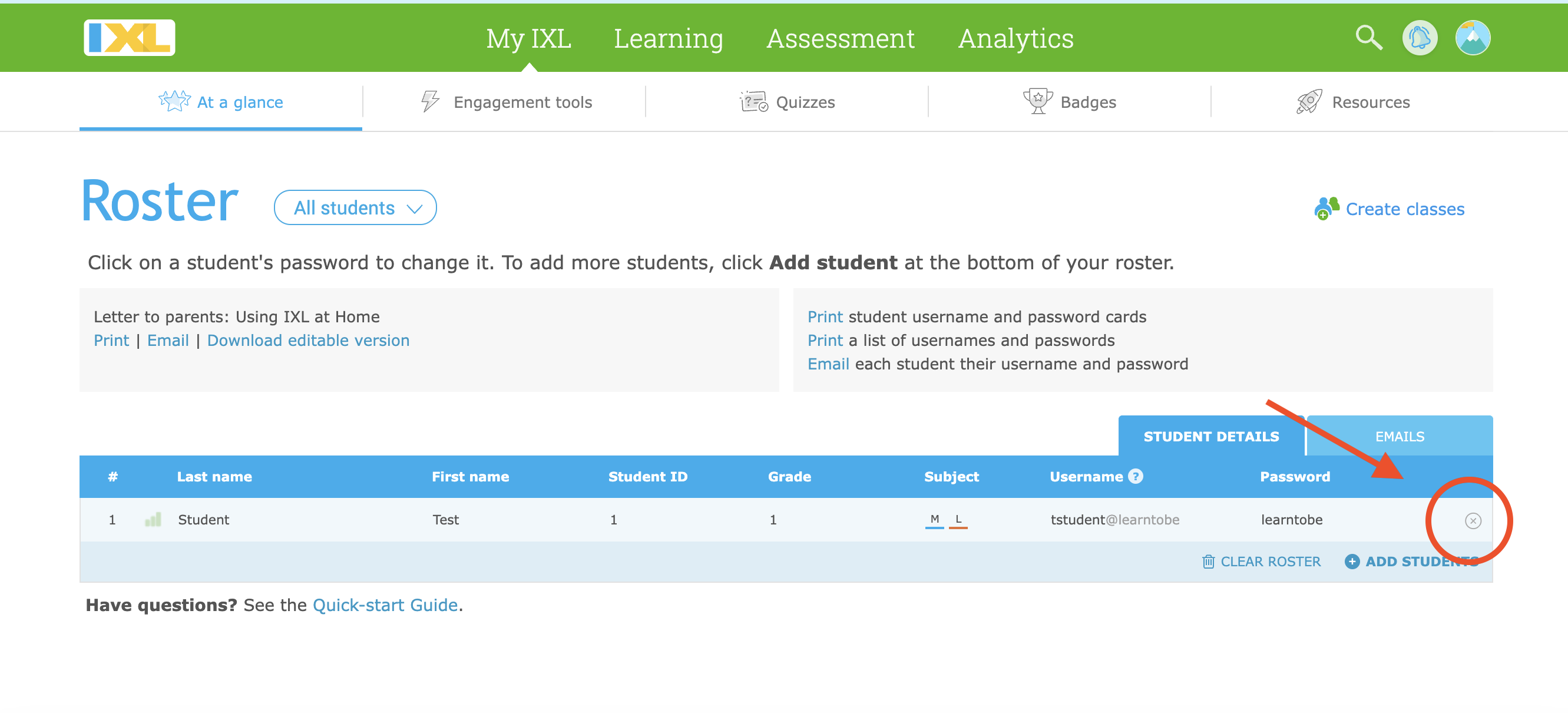 If you put your student on your IXL roster but you know they're not using IXL, you can remove them easily by going to your roster and selecting the "x" on the right side next to their information.